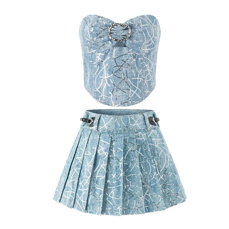 This set is not just a fashion piece; it’s a trip down memory lane. The combination of the off-the-shoulder corset top and the mini pleated skirt brings together the best elements of 90s fashion, giving you a unique and unforgettable look. The sequins add that touch of glam that turns heads and sparks conversations.