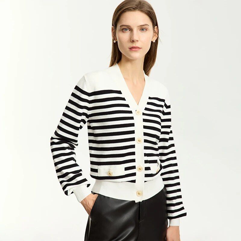 Introducing our latest addition to your autumn wardrobe – the Chic Striped V-Neck Cardigan. Blending elegance with comfort, this piece is a testament to modern sophistication and a must-have for the stylish, contemporary woman. Whether you’re in the office or out for a casual day, this cardigan offers the perfect balance of style and practicality.