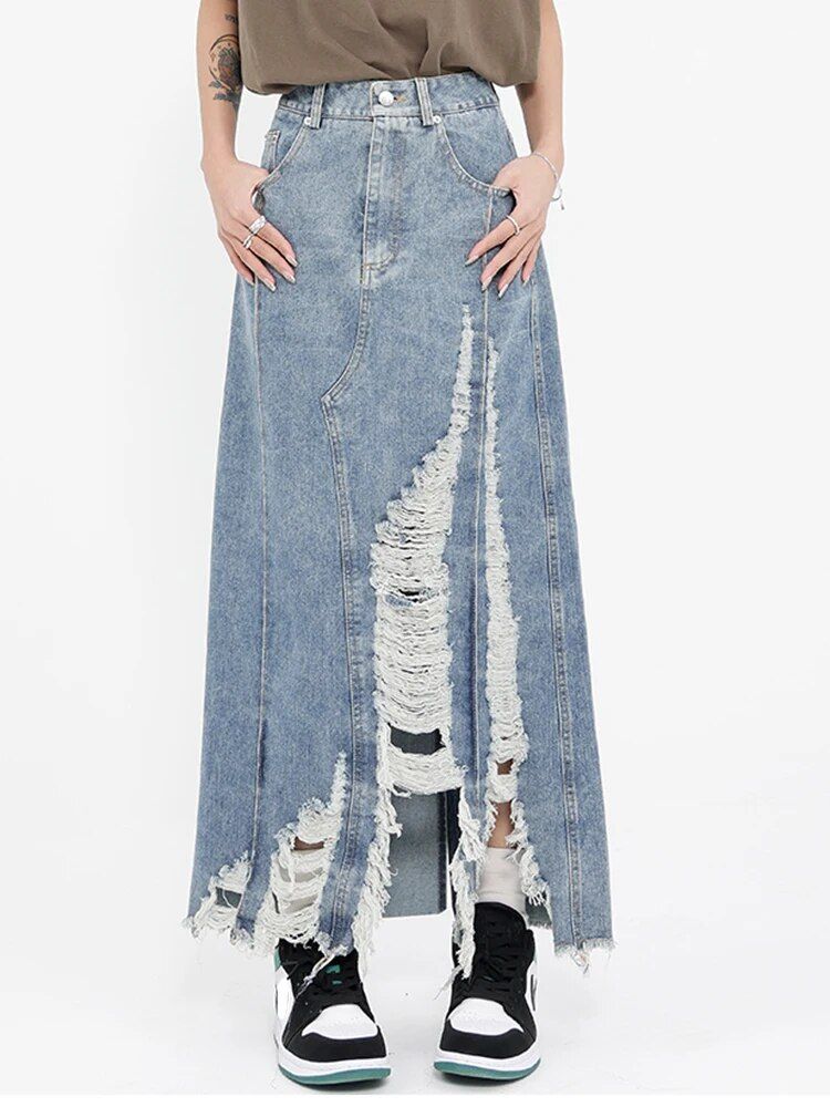Indulge in the perfect blend of fashion-forward design and casual comfort with our High Waist Denim Holes Irregular Burr Long Casual Half-body Skirt. This statement piece is not just a skirt; it’s a fashion tide, a symbol of confidence and flair.