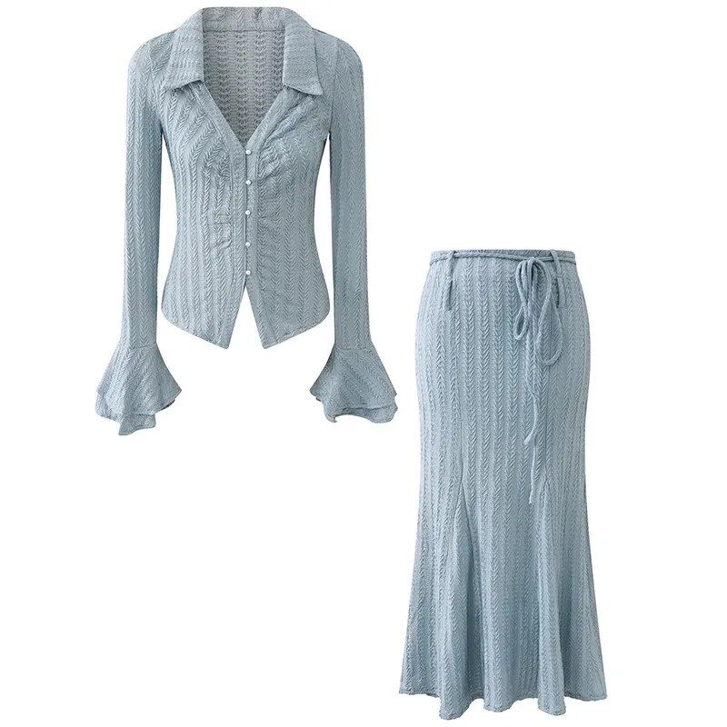 This captivating set features a V-neck, flare-sleeved cardigan paired with a bandage fishtail long skirt. Crafted with a blend of cotton and polyester, the fabric ensures comfort while maintaining a chic silhouette. The intricate details, including draped accents, ruched patterns, buttons, and a single-breasted closure, add a touch of glamour to your ensemble.